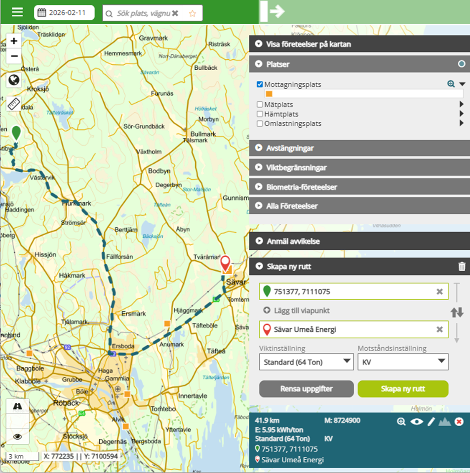Bildet viser en beregnet rute – grønn stiplet linje – for et standardkjøretøy fra et hentested i skogen til et foredlingsanlegg i Sävar, nord for Umeå. Avstanden er 41,9 km, og energiforbruket er 5,95 kWh/tonn.